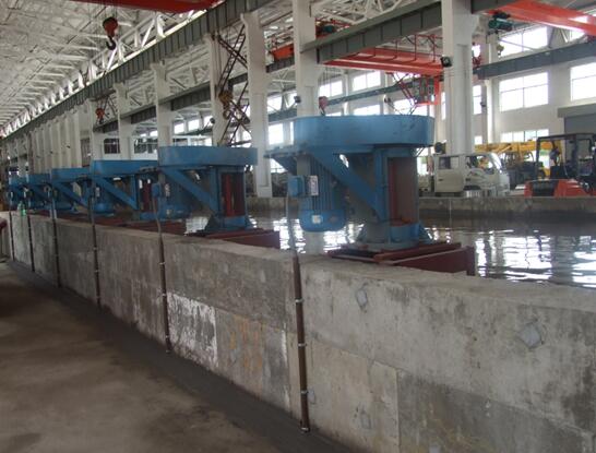 浸出槽是礦山冶金主要設(shè)備之一,用攪拌器使物料在溶液中處于懸浮狀態(tài)的浸出方法。物料和浸出劑按一定的比例調(diào)漿,調(diào)成的礦漿密度一般為10%~50%。在浸出過(guò)程中,利甩設(shè)置在攪拌槽中的攪拌裝置使空氣與固體液體充分接觸混合均勻以及固體顆粒懸浮。旋槳式ZCX,斜葉槳式(XJ、HJ),開(kāi)啟渦輪式(XKK,MK,ZK)。