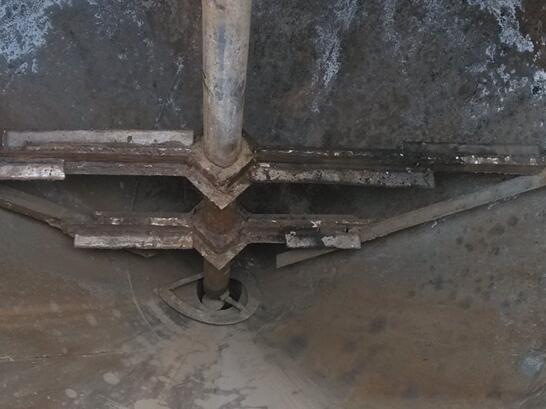 濃磷酸沉降槽是磷銨裝置的主要設(shè)備,主要使用刮泥機(jī)將濃縮后的磷酸收集,這個(gè)過(guò)程中容易出現(xiàn)筒底錐部的集料導(dǎo)致壓耙現(xiàn)象,需停車修理。我公司設(shè)計(jì)的刮泥機(jī)具有扭矩控制系統(tǒng),在扭動(dòng)達(dá)到設(shè)計(jì)值之后,攪拌軸與耙壁自動(dòng)提升,等錐底部物料松動(dòng)扭動(dòng)下降,則攪拌軸與耙壁自動(dòng)下降繼續(xù)工作,有效的避免了壓耙現(xiàn)場(chǎng)。